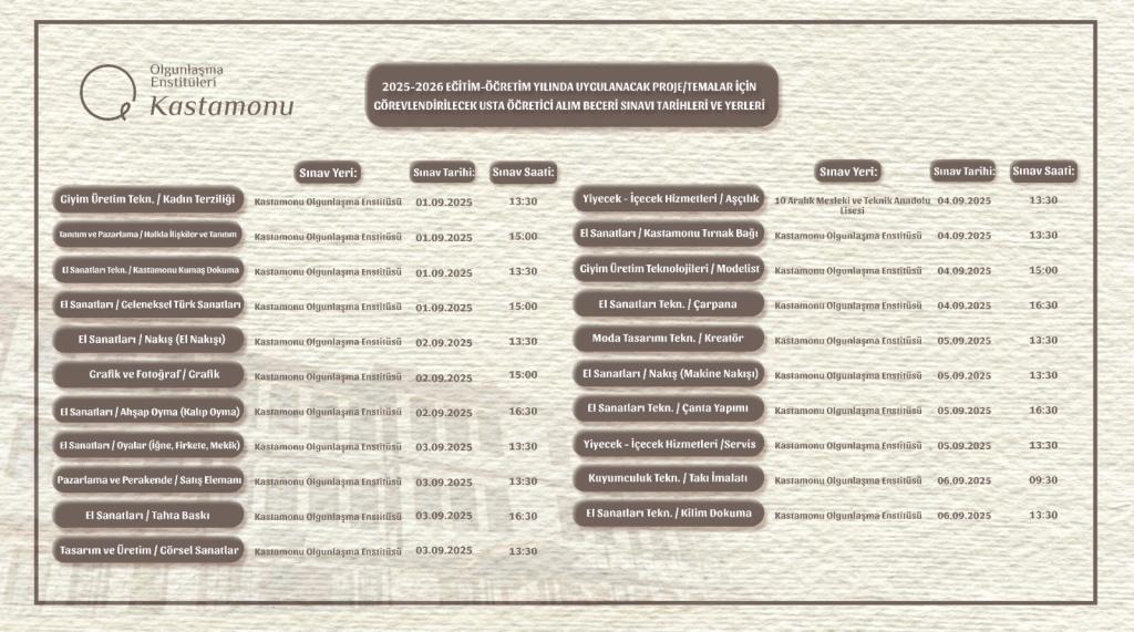 2025 - 2026 Eğitim Öğretim yılı Ücretli Usta Öğretici sınav takvimi altta yer alan görselde ilan edilmiştir.